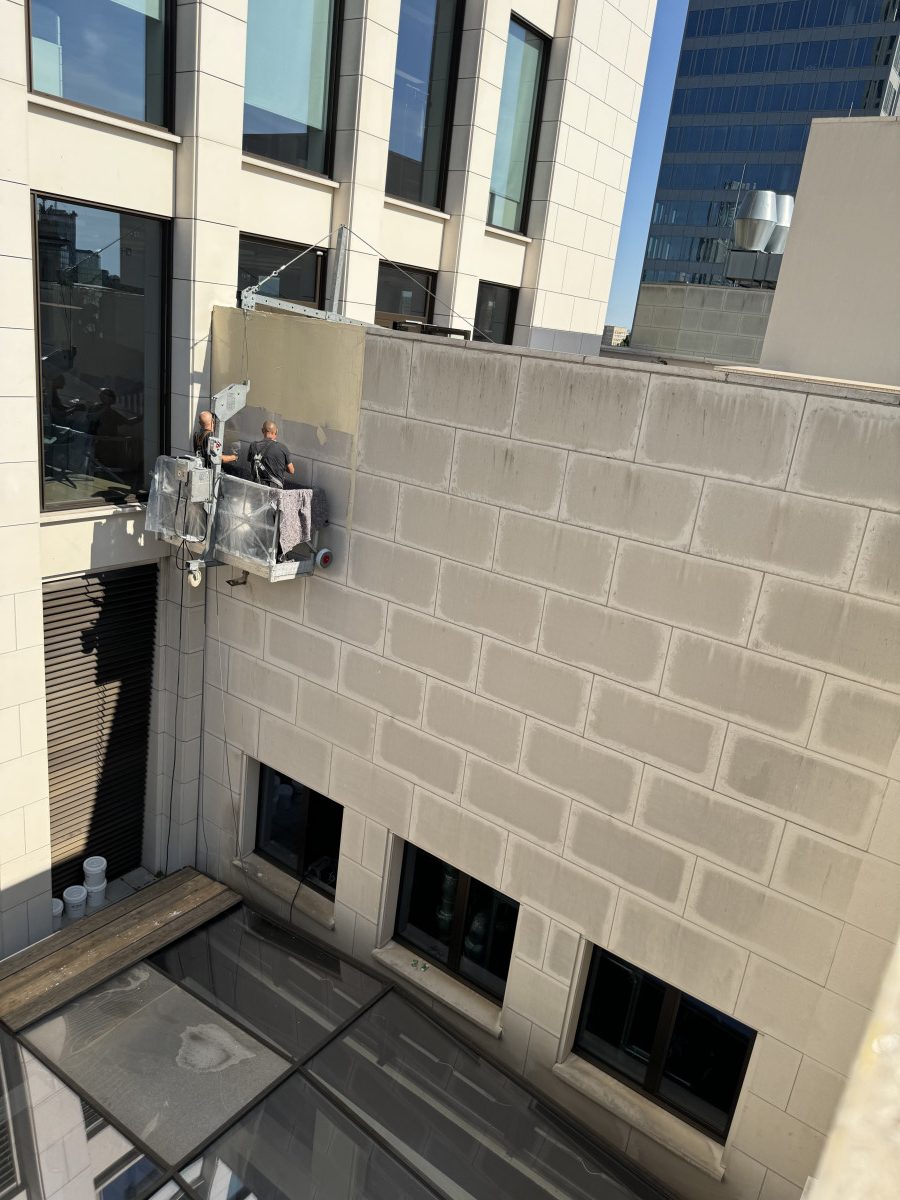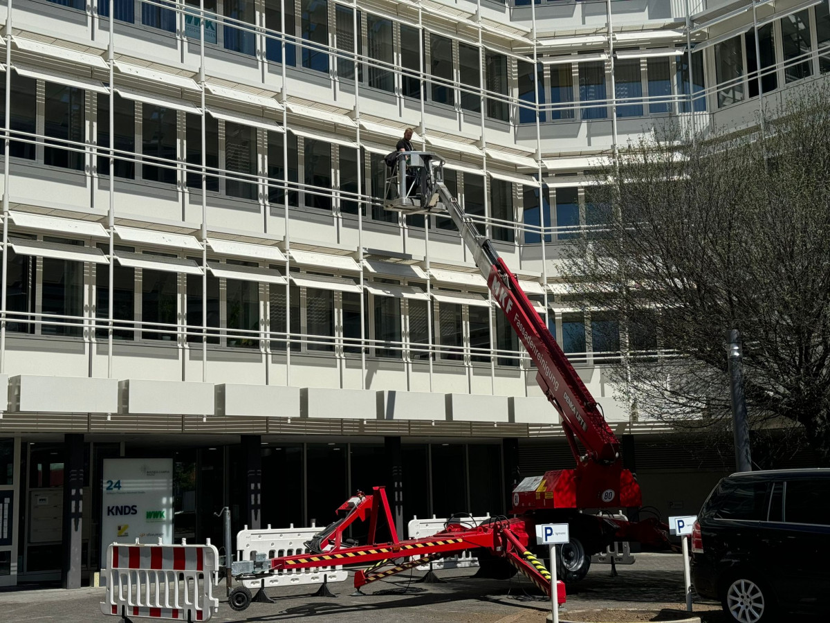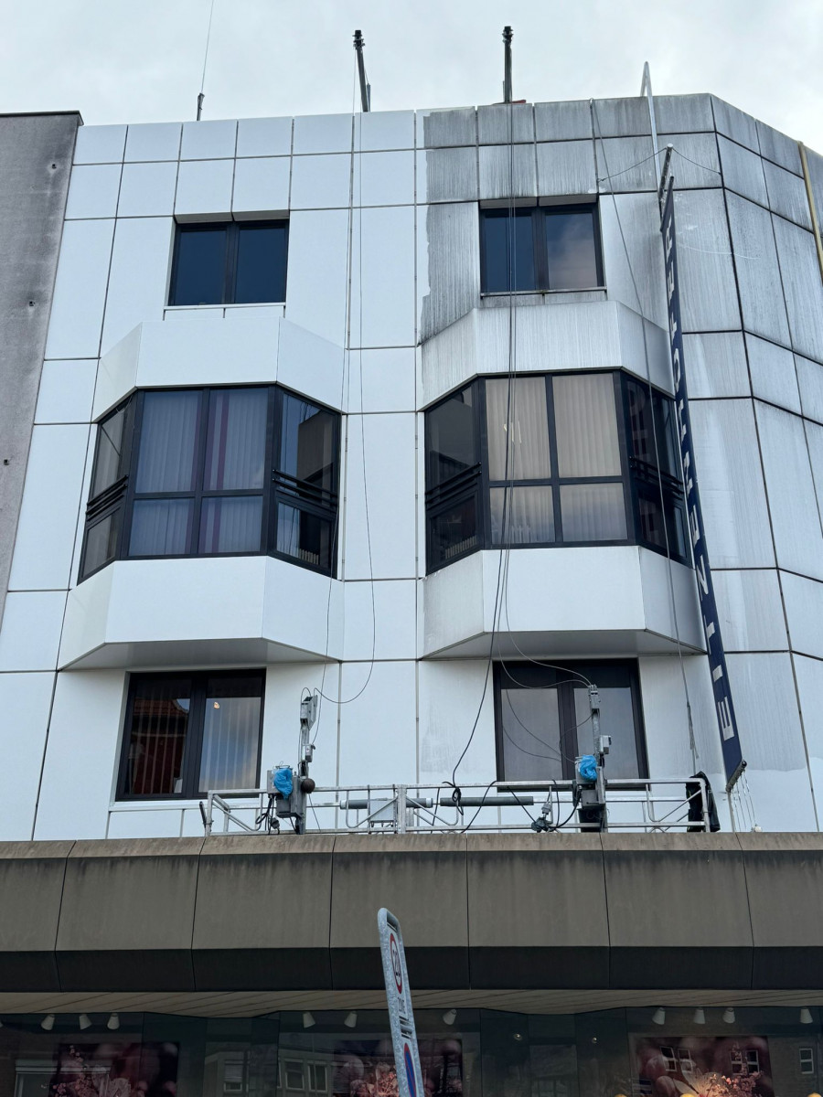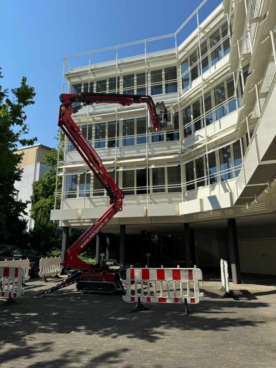 Konservierende Pulverlackfassadenreinigung mit mehreren Arbeitsbühnen