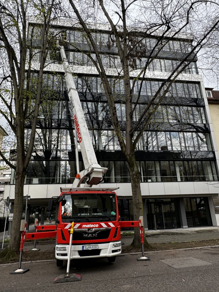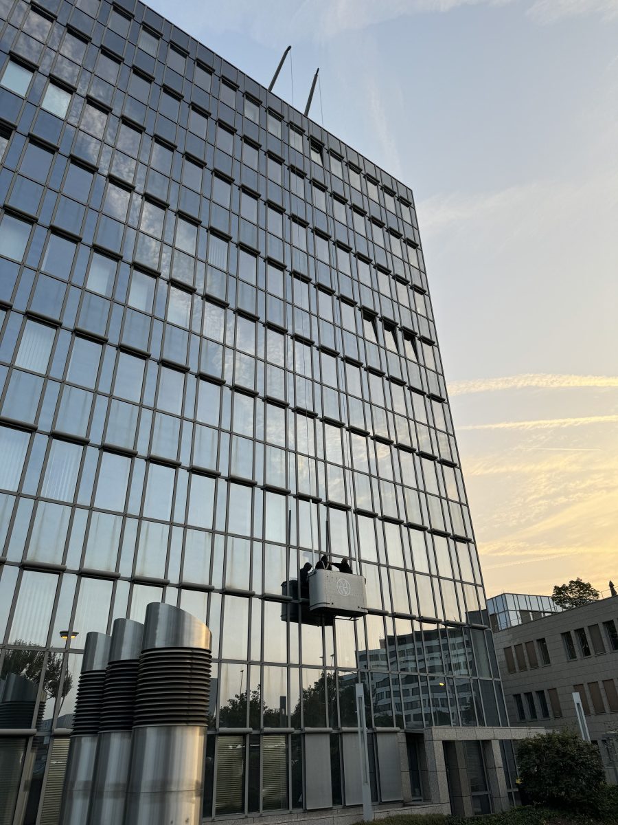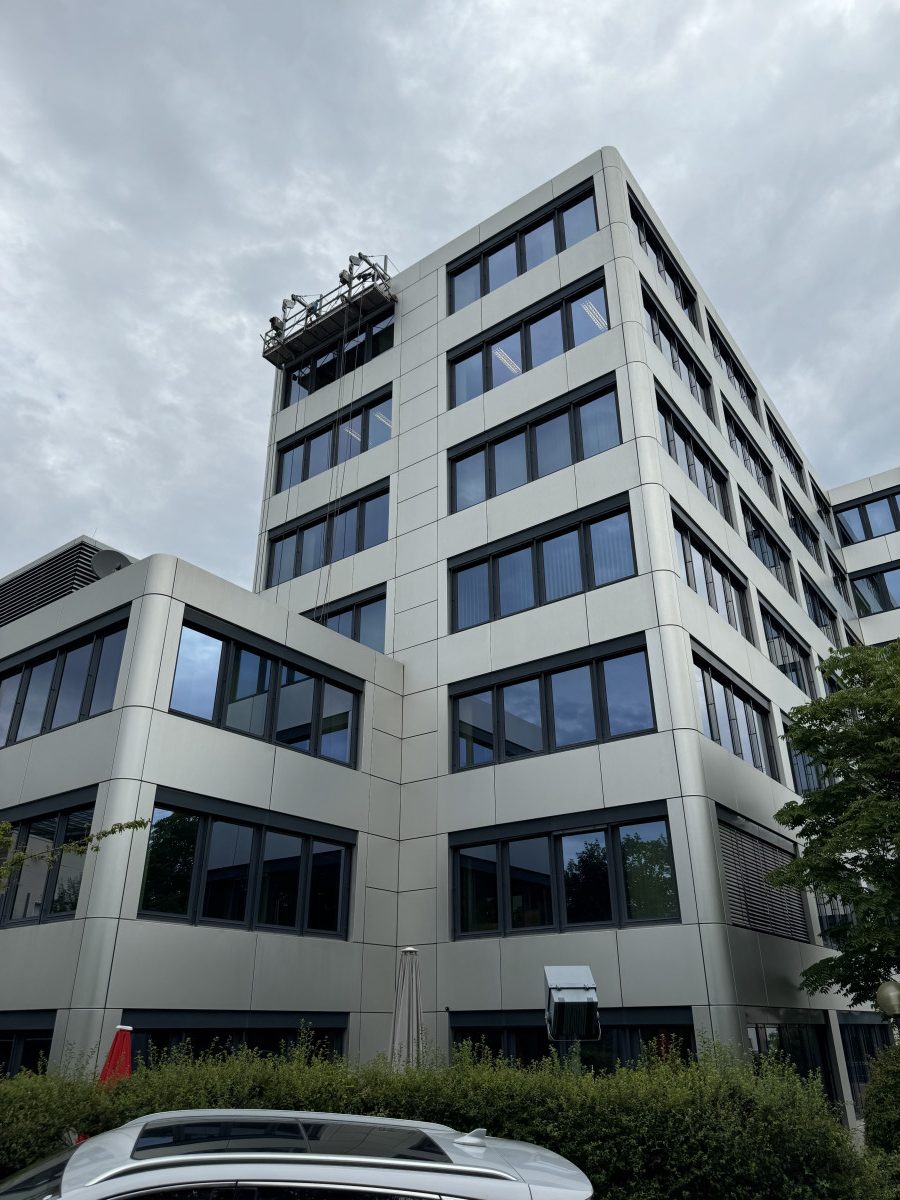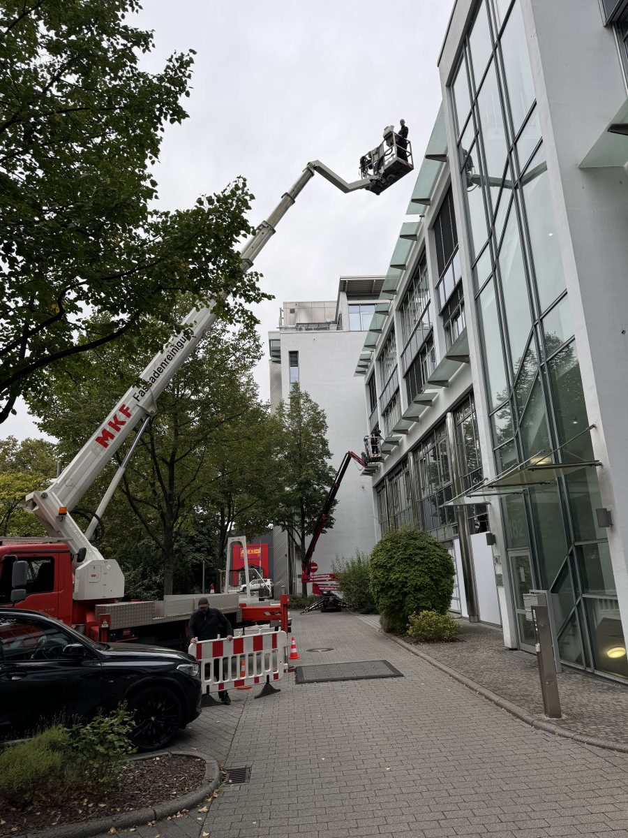 Glas- und Fassadenreinigung mit Befahranlage und Arbeitsbühne.