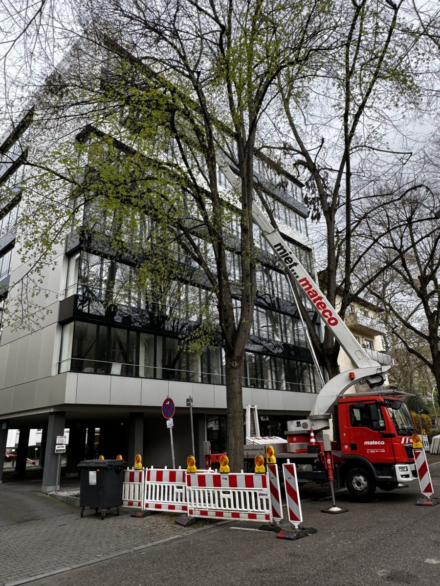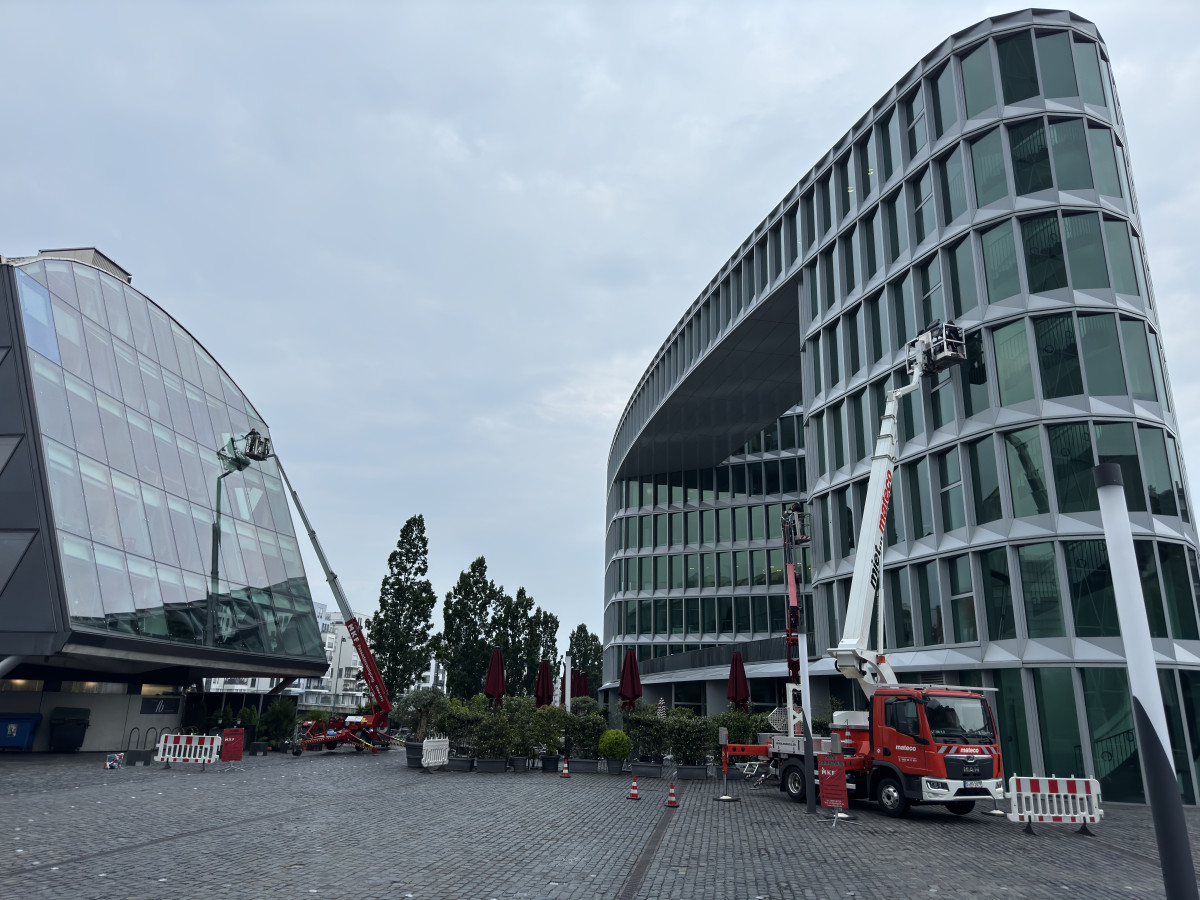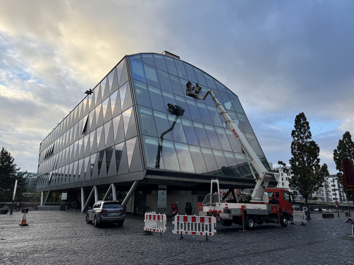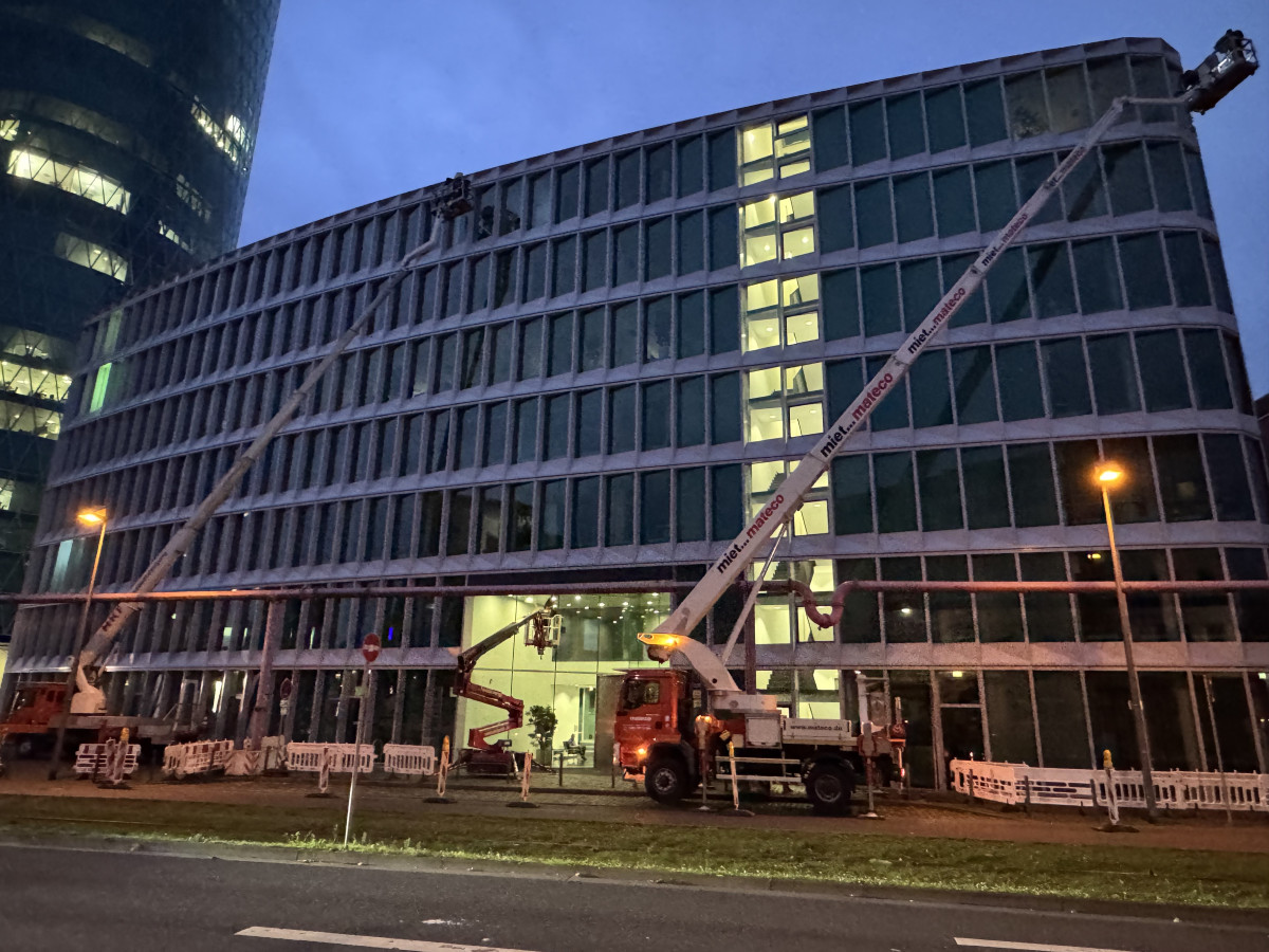 Glas- und Fassadenreinigung mit Befahranlage und Arbeitsbühne.