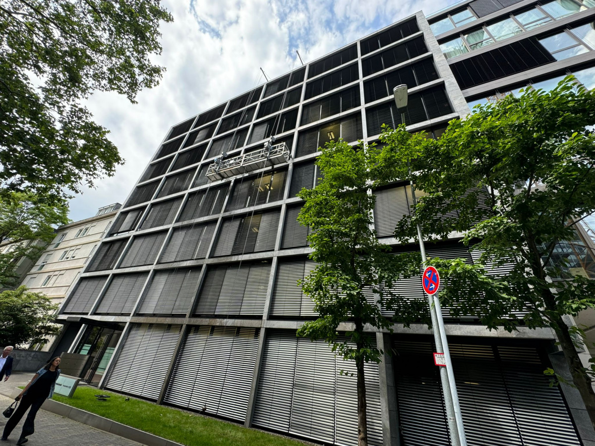 Konservierende Fassadenreinigung mit Jalousien und Glas inkl. mobilen Befahranlagen