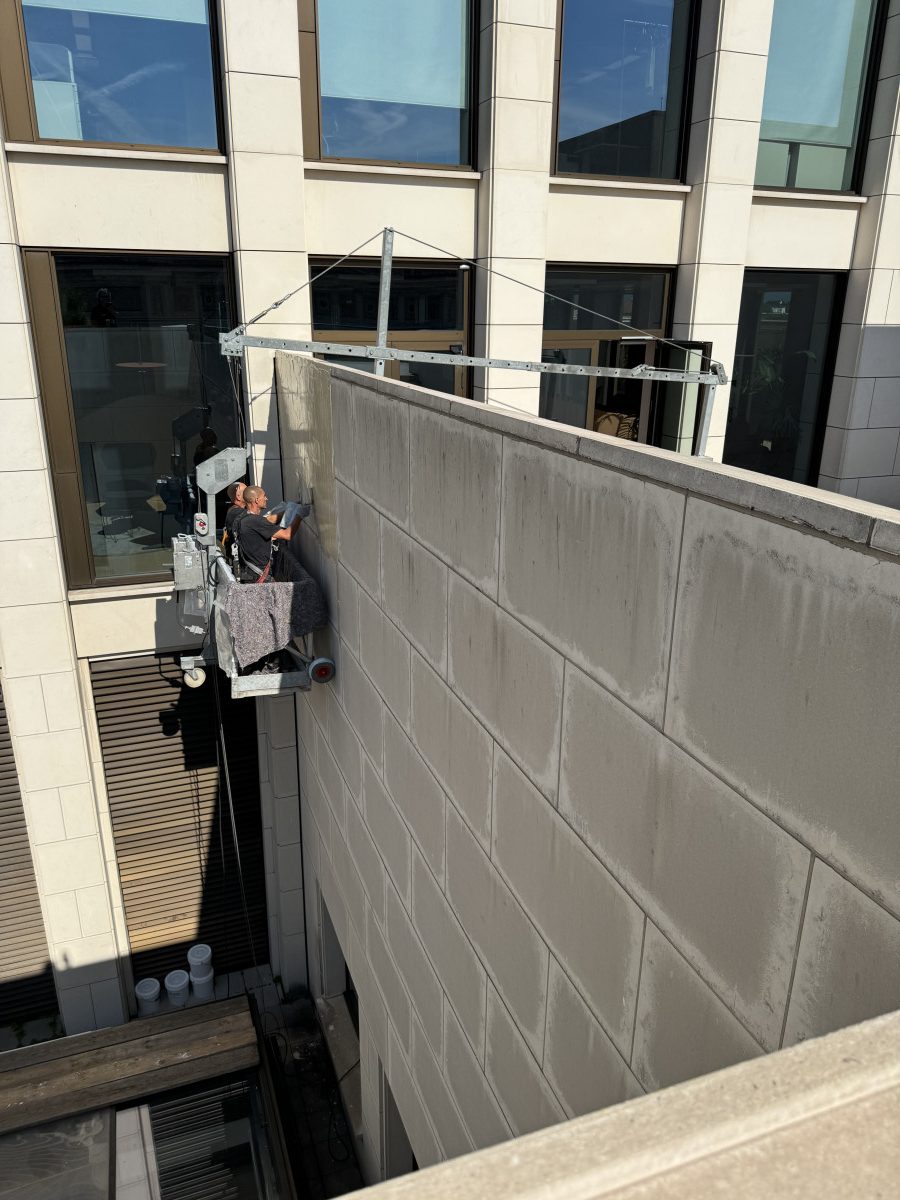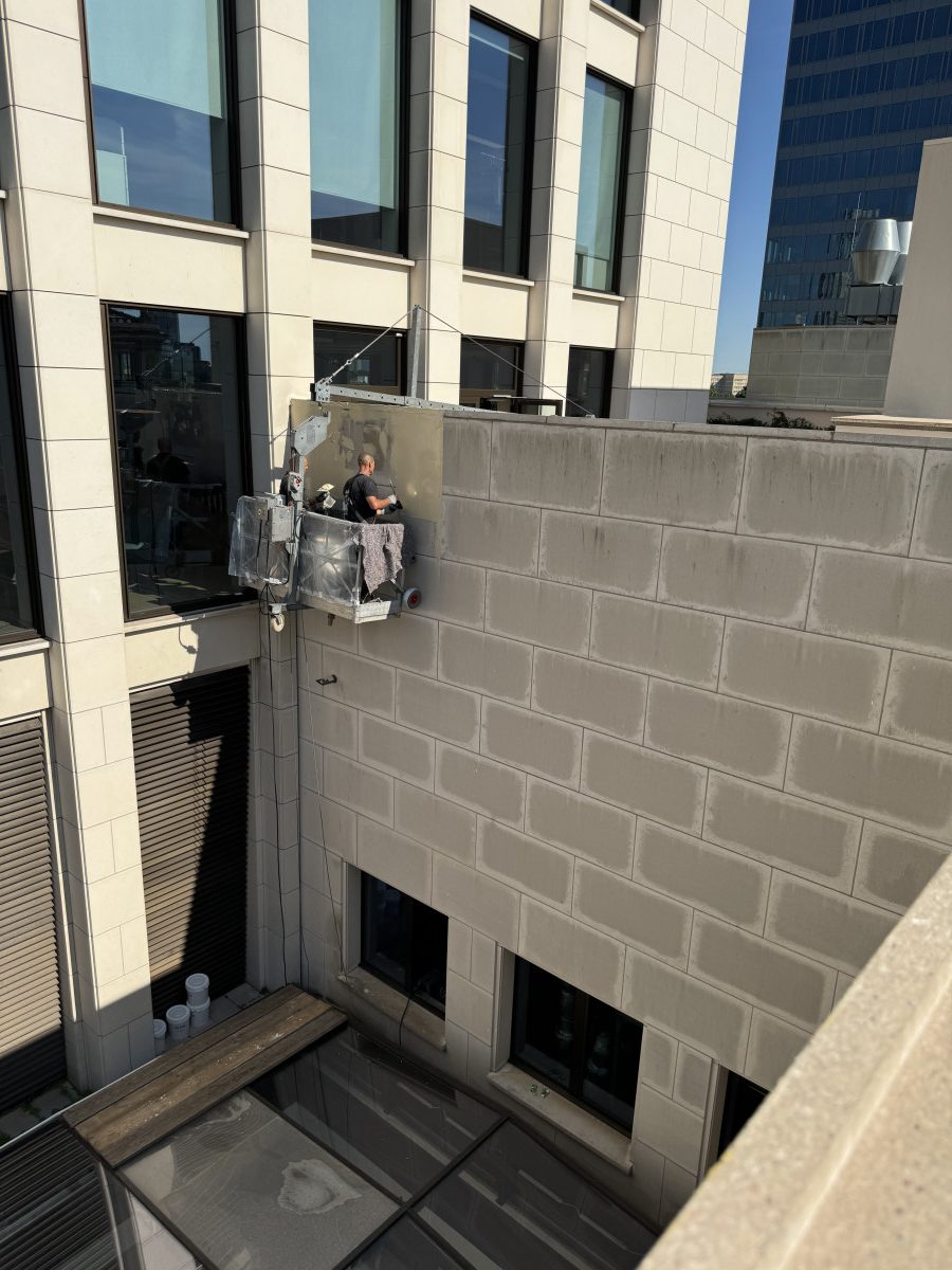 Steinfassadenreinigung mit Paste und mobiler Montagegondel