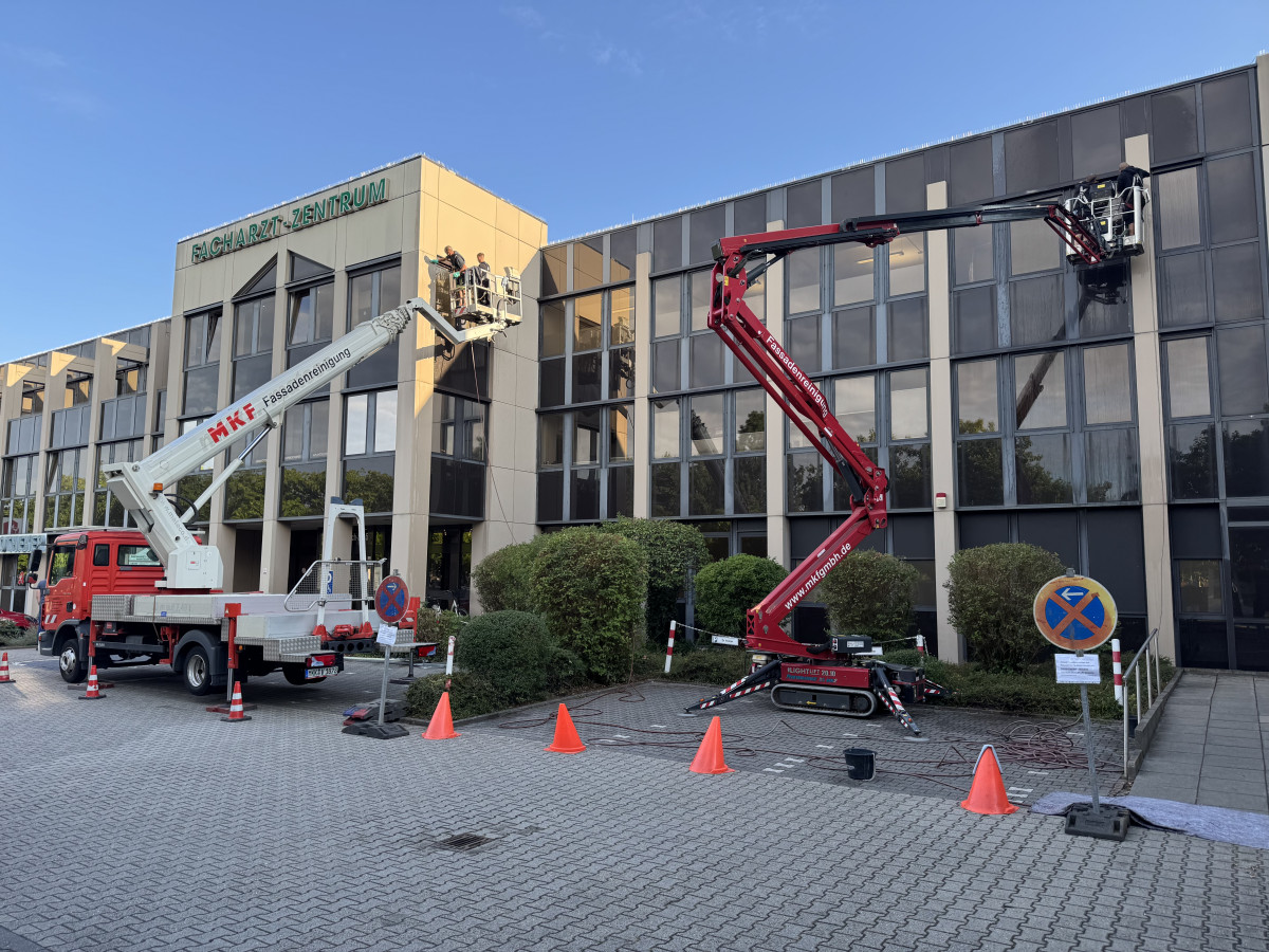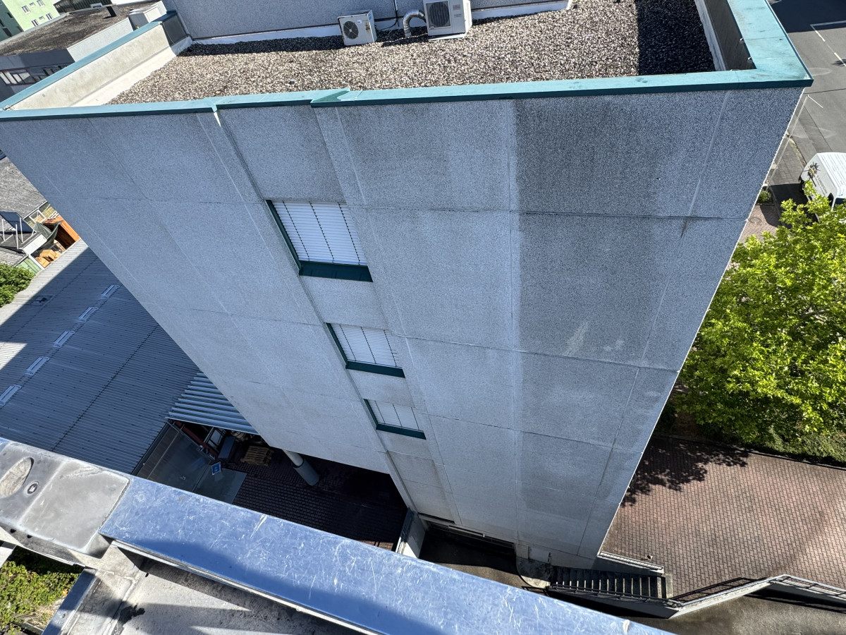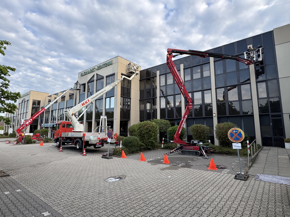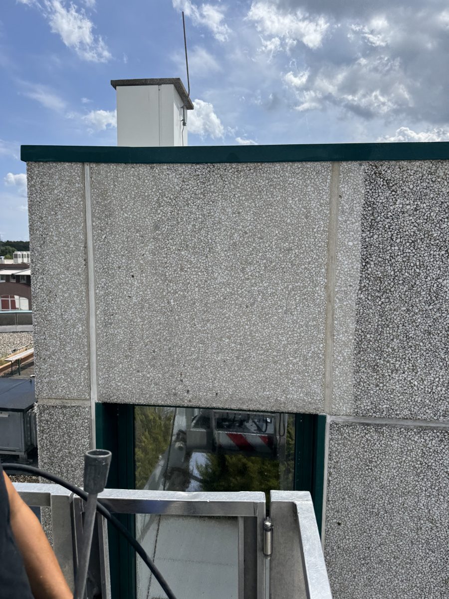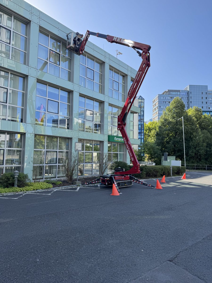 Abrasive, Konservierende PU-Lackfassadenreinigung mit Hubsteiger