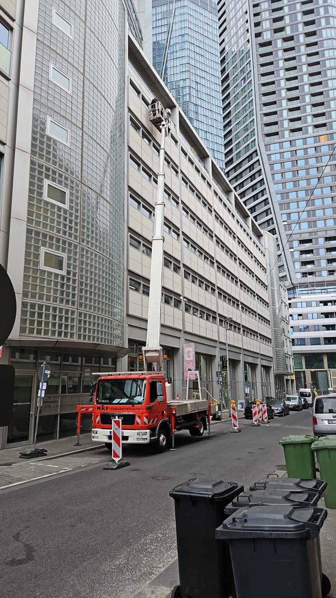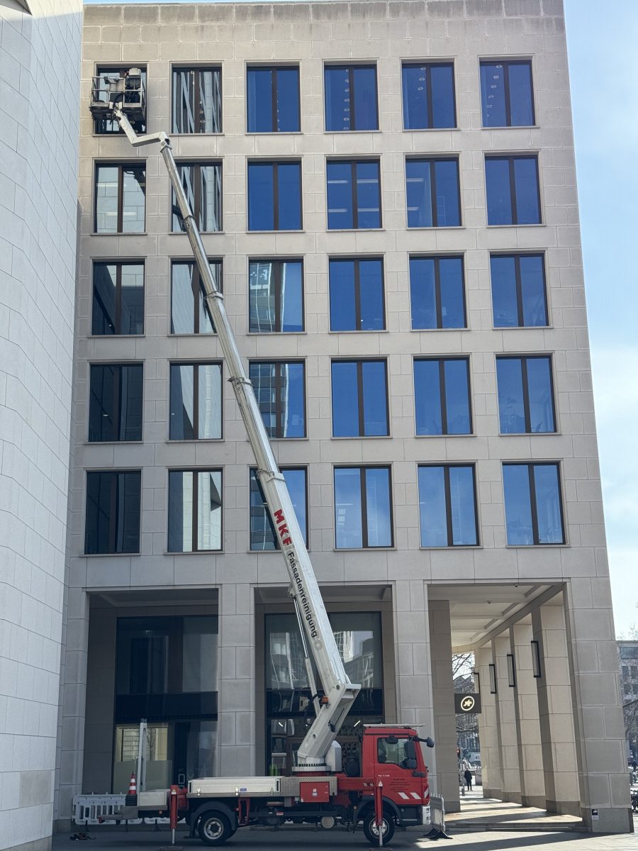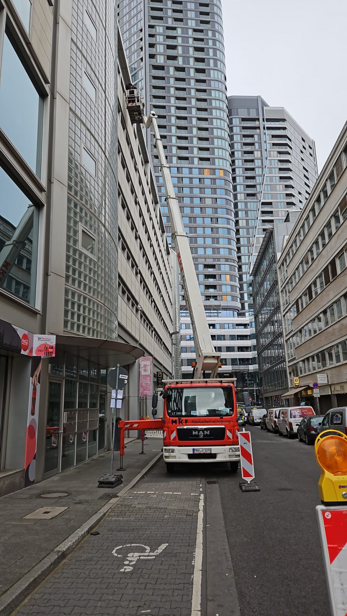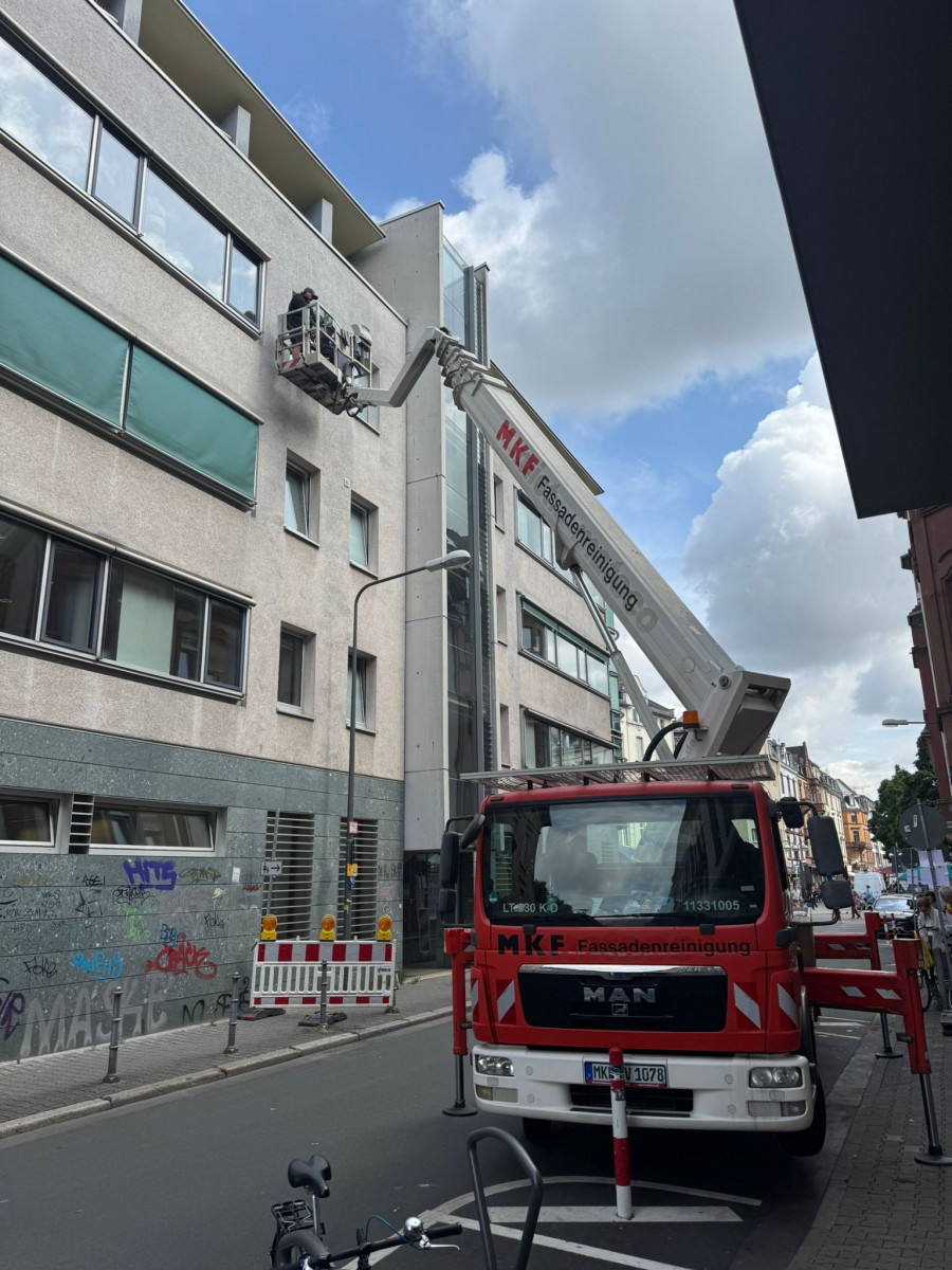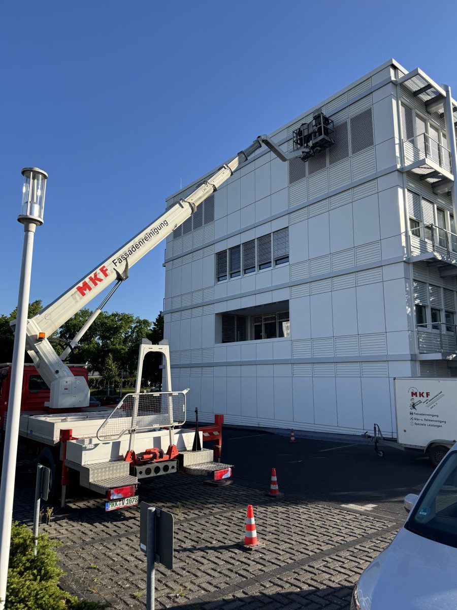 Abrasive, Konservierende PU-Lackfassadenreinigung mit Hubsteiger