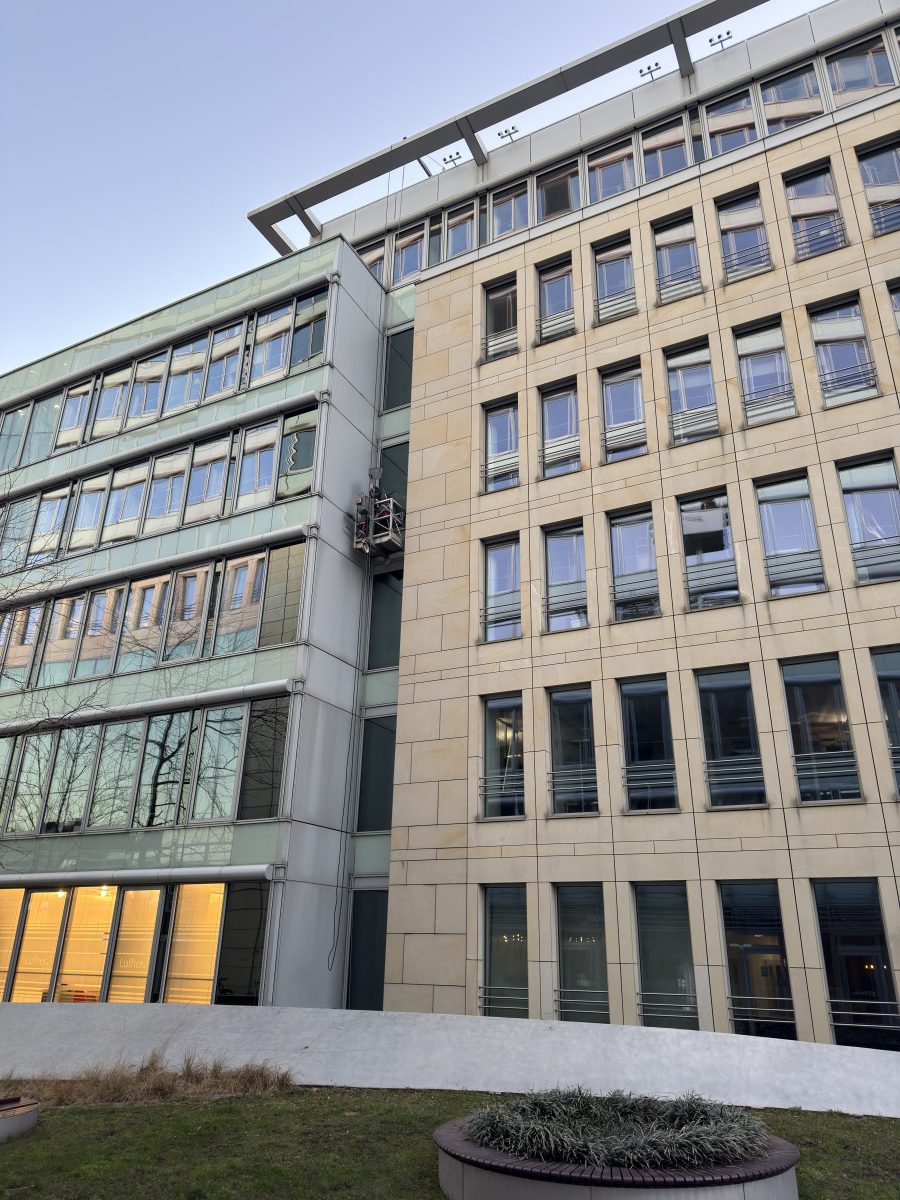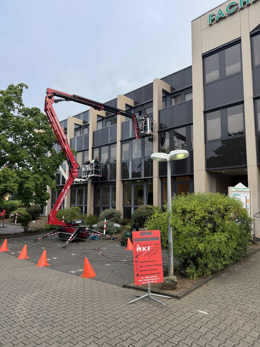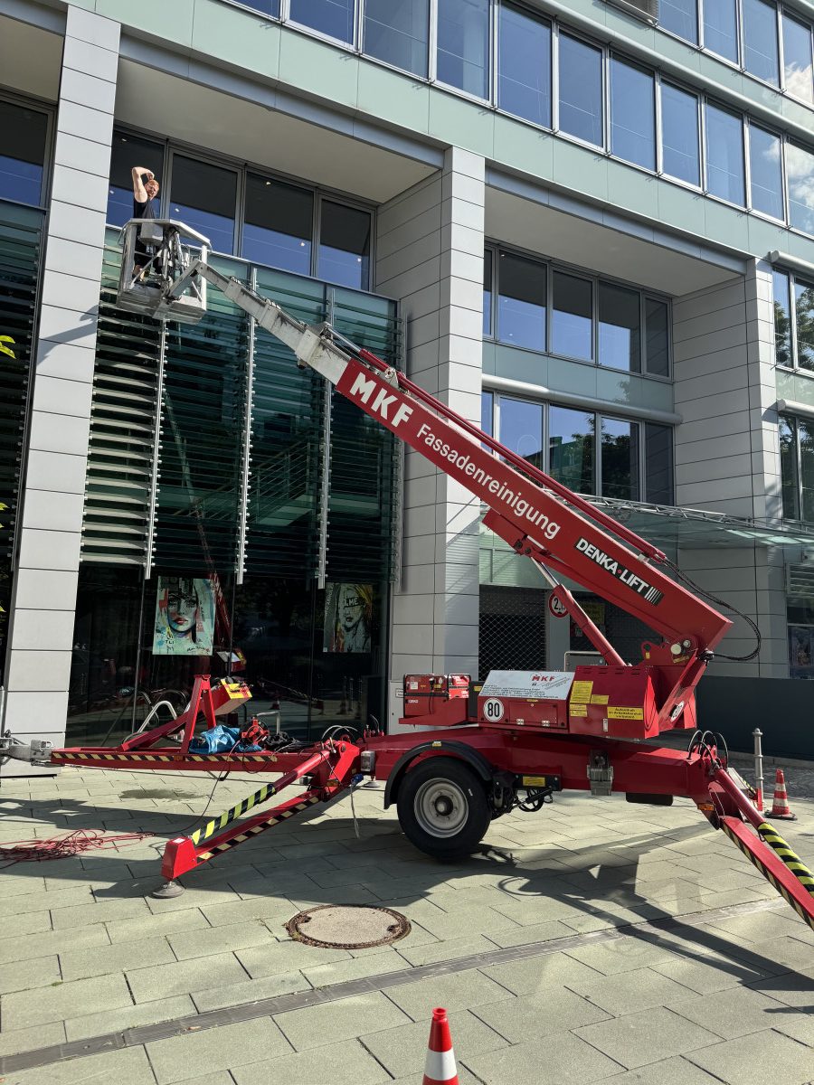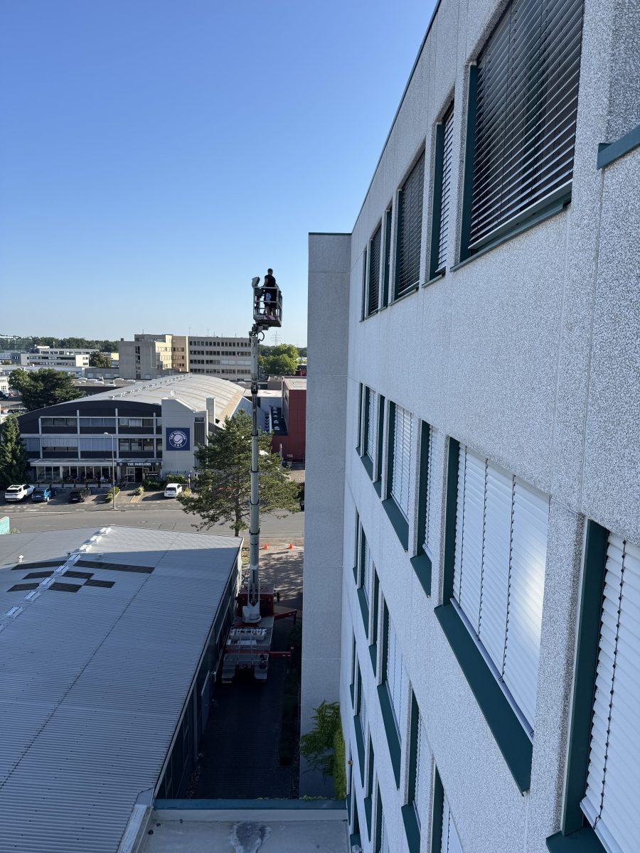 Abrasive, Konservierende PU-Lackfassadenreinigung mit Hubsteiger