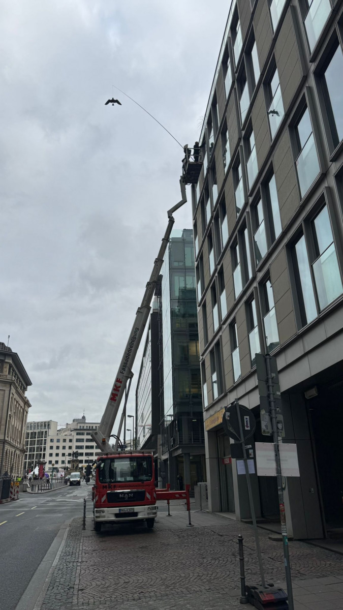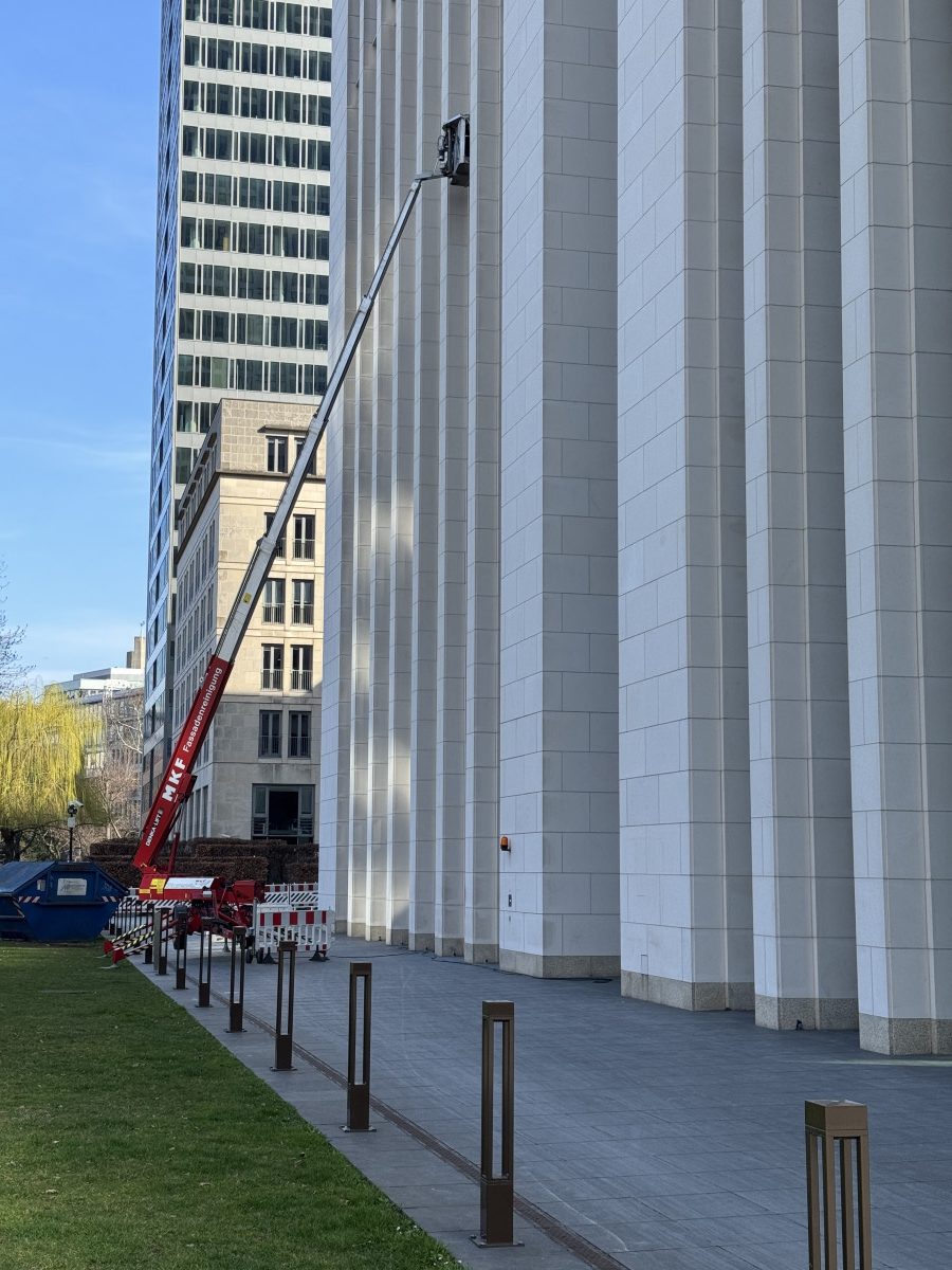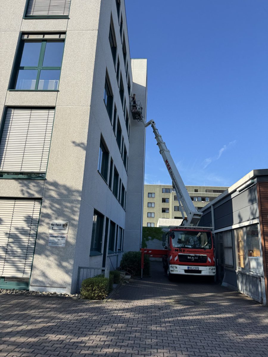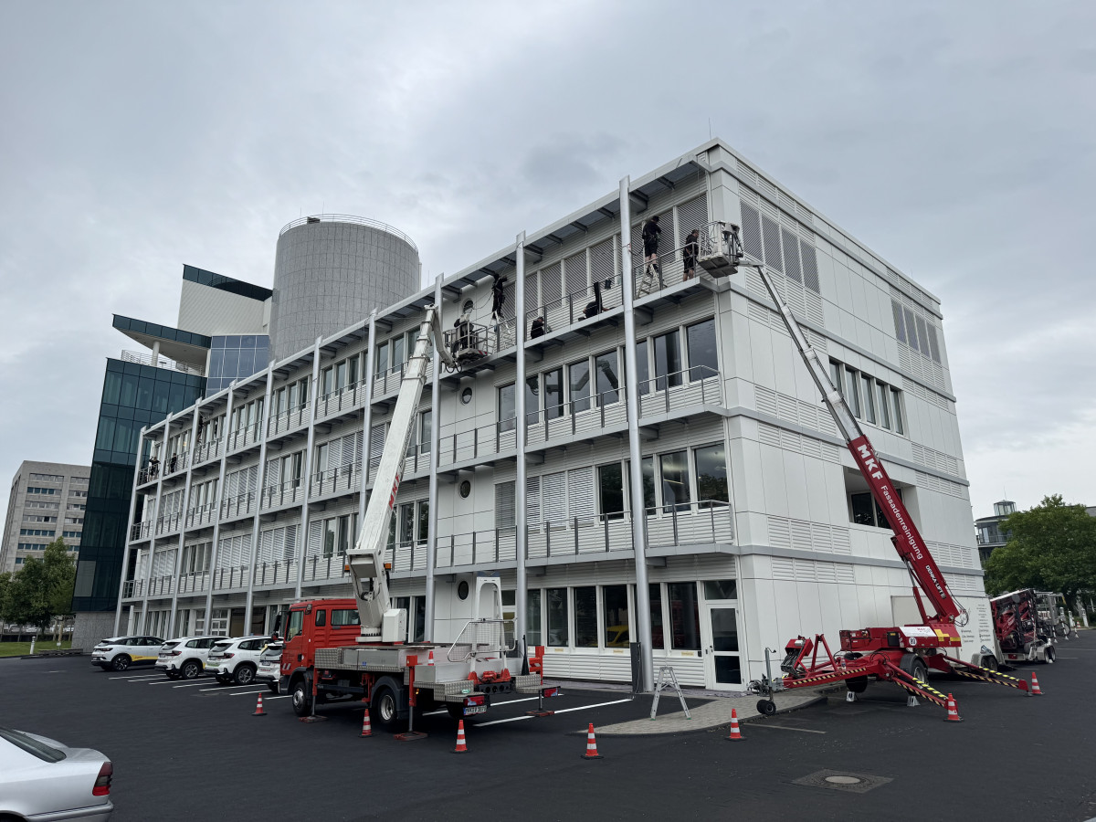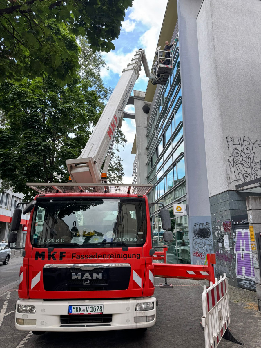 Abrasive, Konservierende PU-Lackfassadenreinigung mit Hubsteiger