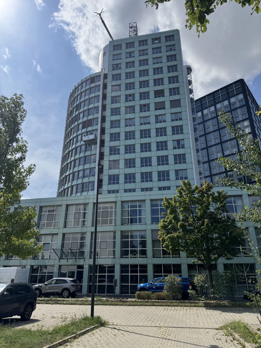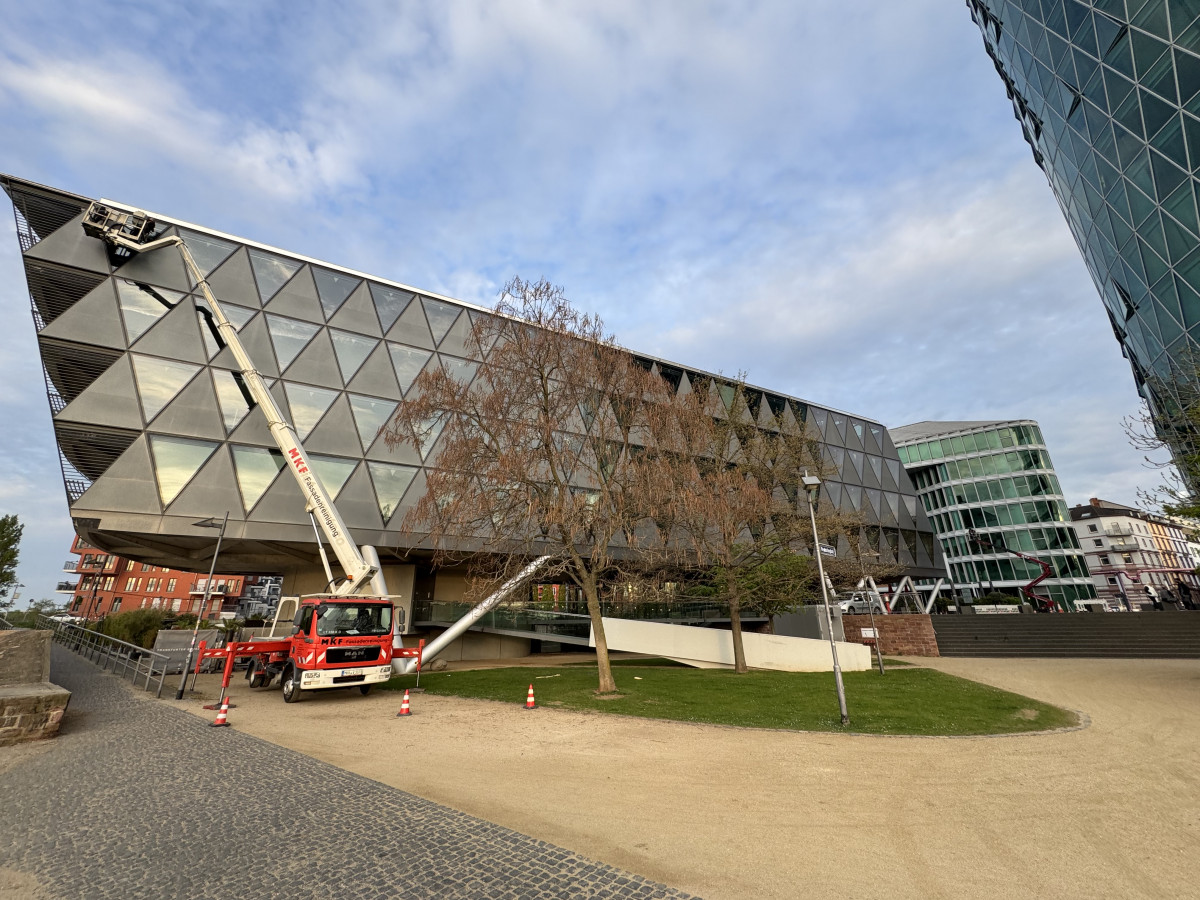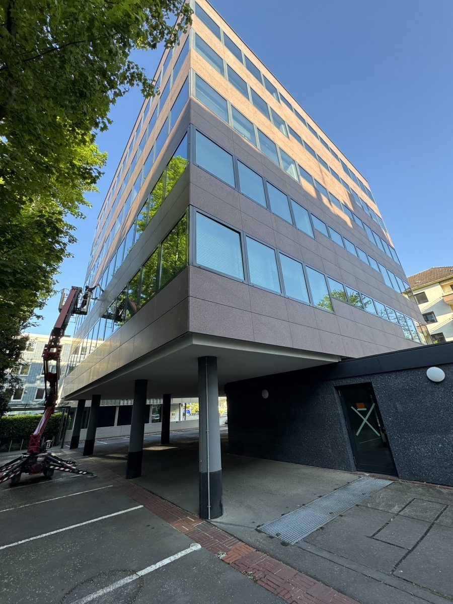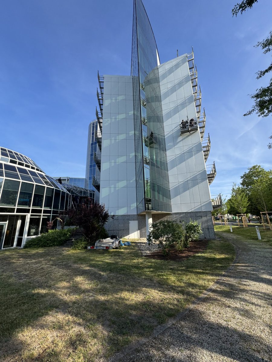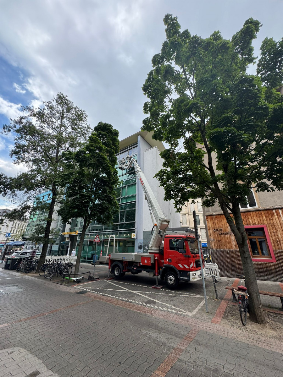 Abrasive, Konservierende PU-Lackfassadenreinigung mit Hubsteiger
