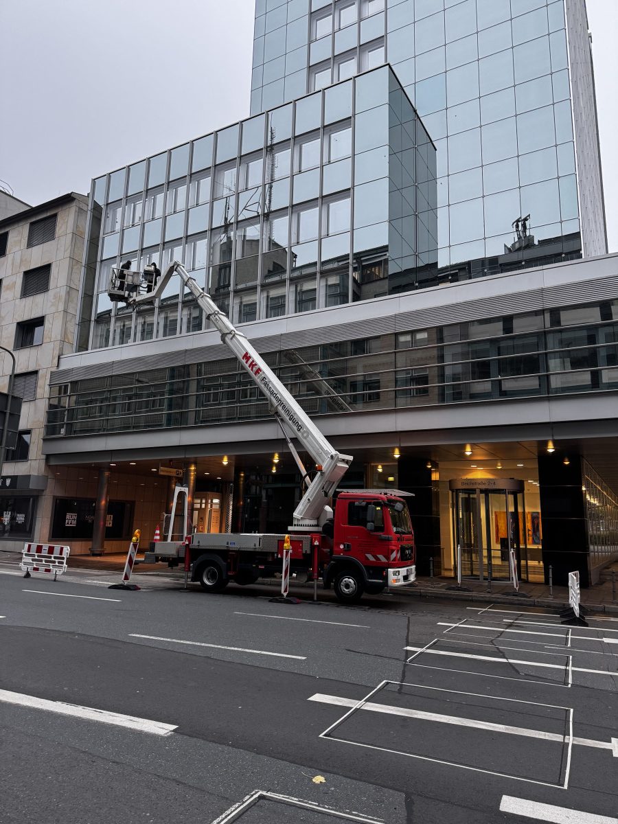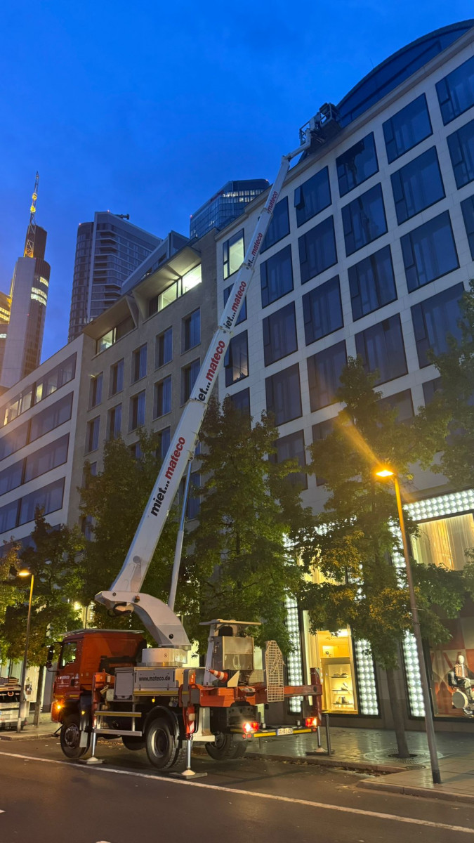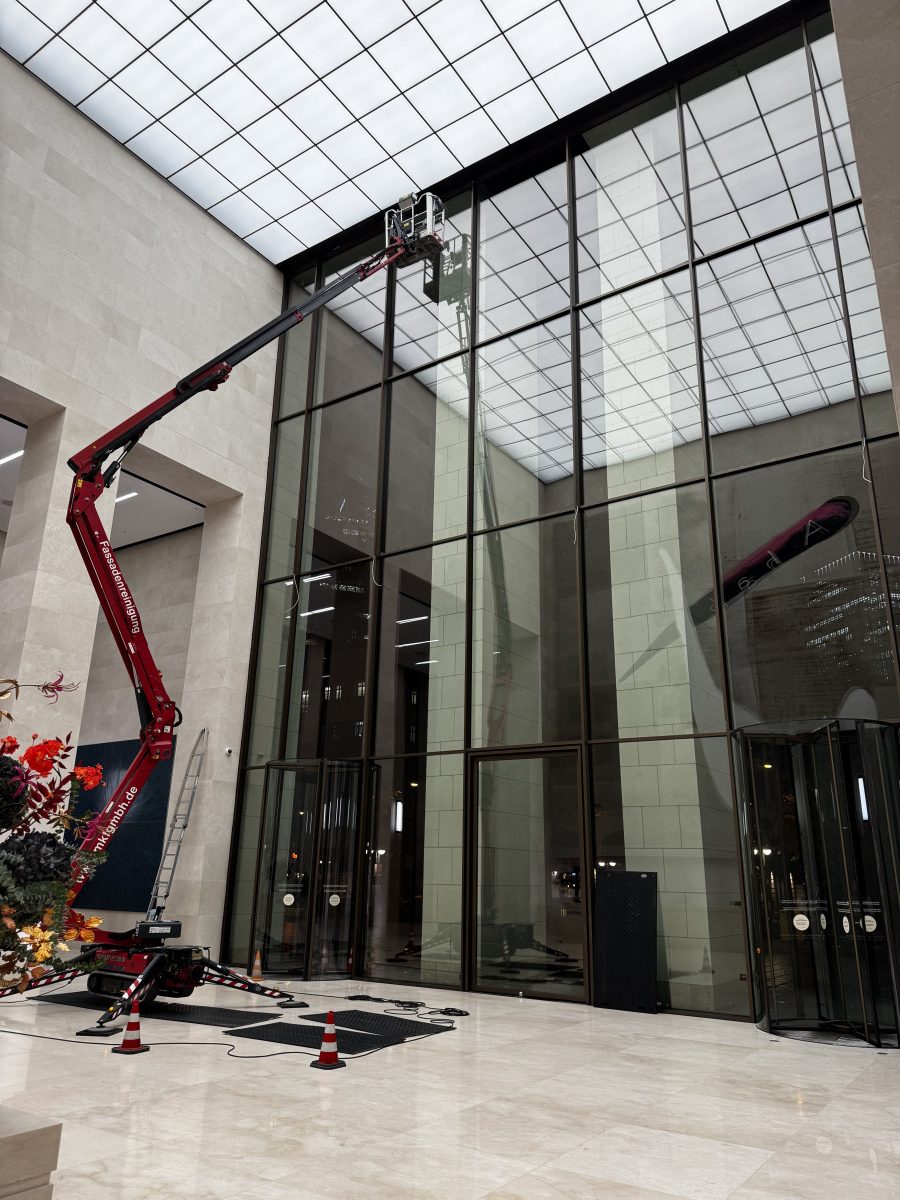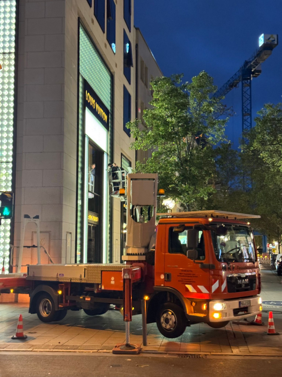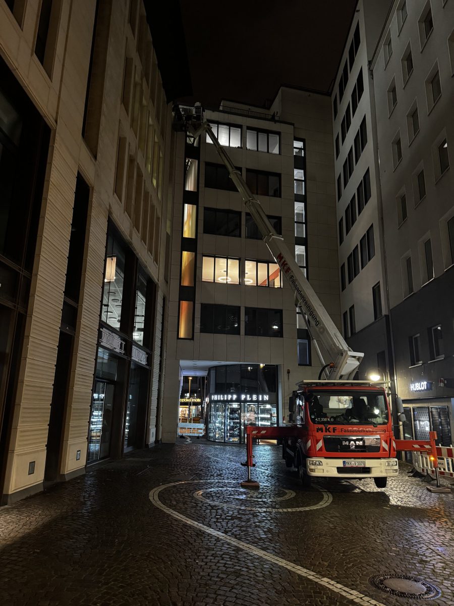 Glas- und Fassadenreinigung mit mehreren Arbeitsbühnen in Nachtarbeit