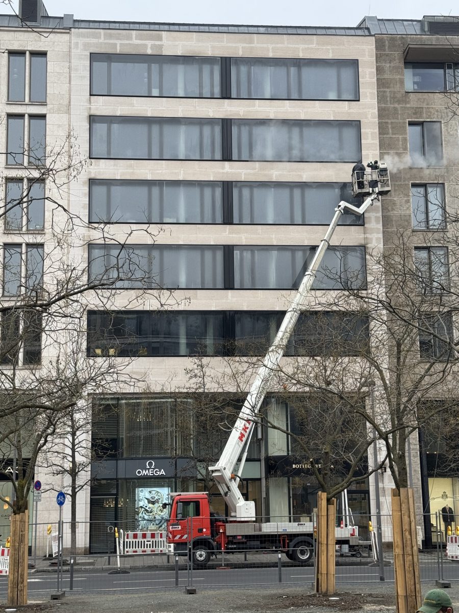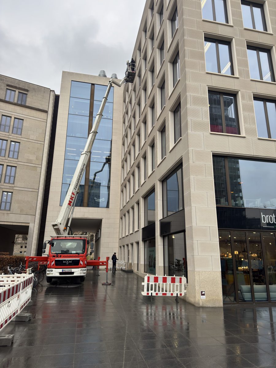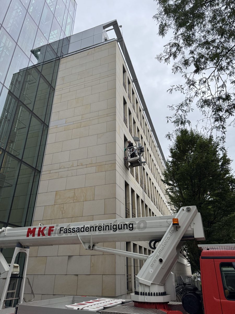 Steinfassadenreinigung mit HD-Gerät und Hubarbeitsbühne
