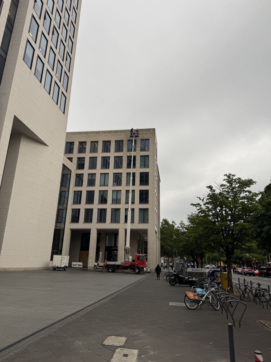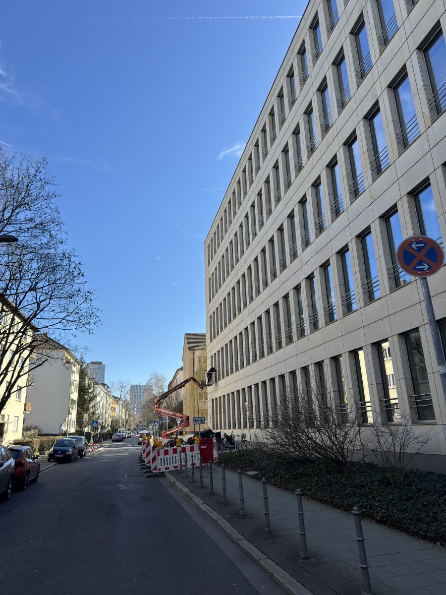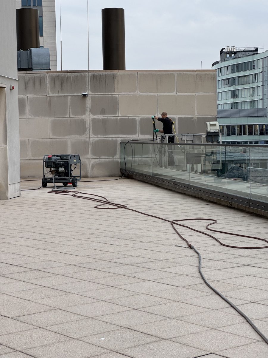 Steinfassadenreinigung mit HD-Gerät und Hubarbeitsbühne